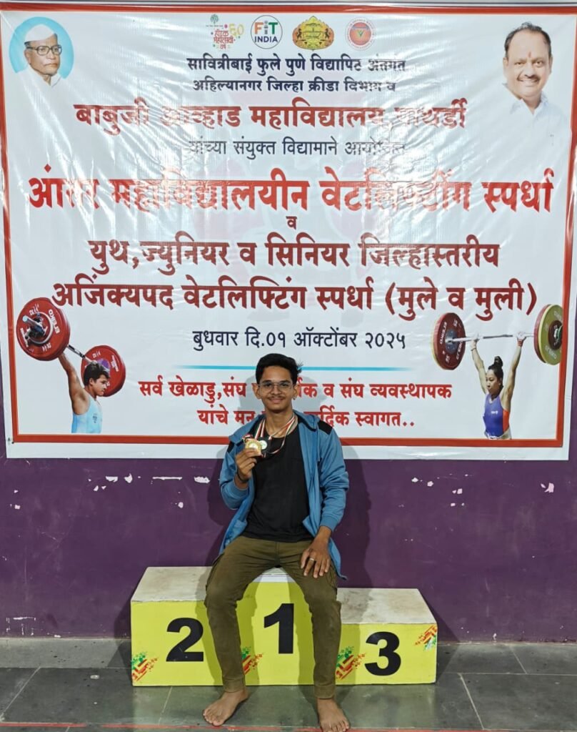 पाथर्डी : सावित्रीबाई फुले विद्यापीठ अंतर्गत जिल्हा क्रीडा विभाग, अहिल्यानगर व बाबूजी आव्हाड महाविद्यालय यांच्या संयुक्त विद्यमाने पाथर्डी शहरातील बाबूजी आव्हाड महाविद्यालयाच्या लोकनेते कै. गोपीनाथ मुंडे क्रीडा संकुलात जिल्हास्तरीय अंतरमहाविद्यालयीन तसेच ज्युनिअर, युवा गटांकरिता वेटलिफ्टिंग अजिंक्यपद स्पर्धेचे आयोजन करण्यात आले होते.